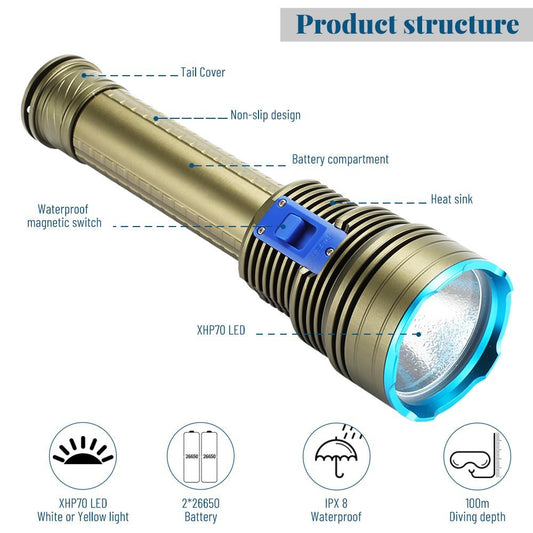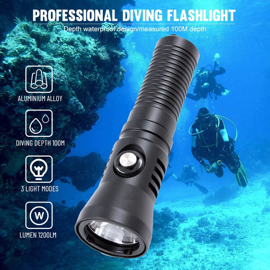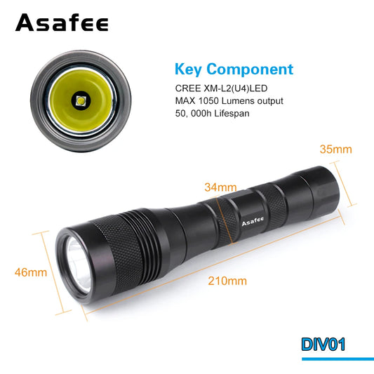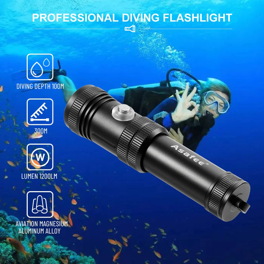Asafee LED Scuba Diving Flashlight Waterproof Canister Lightweight Torch 100M Underwater Lamp Spotlight Deep Lantern Outdoor