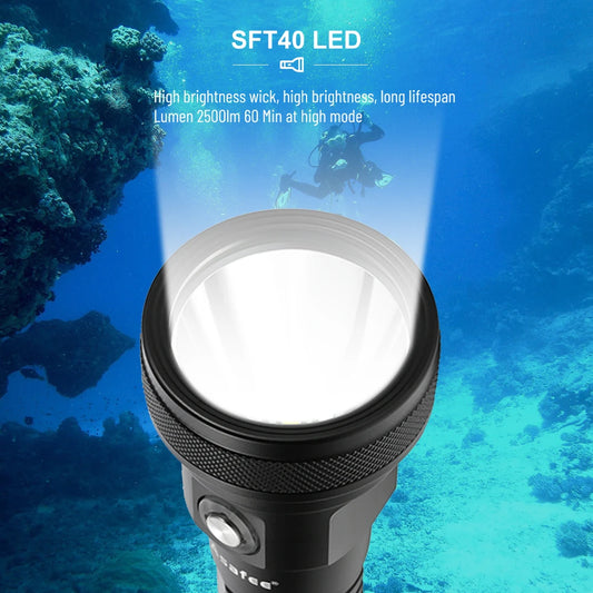 Asafee DT40 Professional Diving Flashlight Portable SST40 LED 2000LM Scuba Lamp Underwater 251m Torch IPX8 Waterproof Dive Light