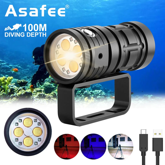Asafee C15 Professional Diving Photograph Flashlight 8000LM Ultra Dive Torch 100M Dept IPX8 Waterproof Red/Blue/White Torch